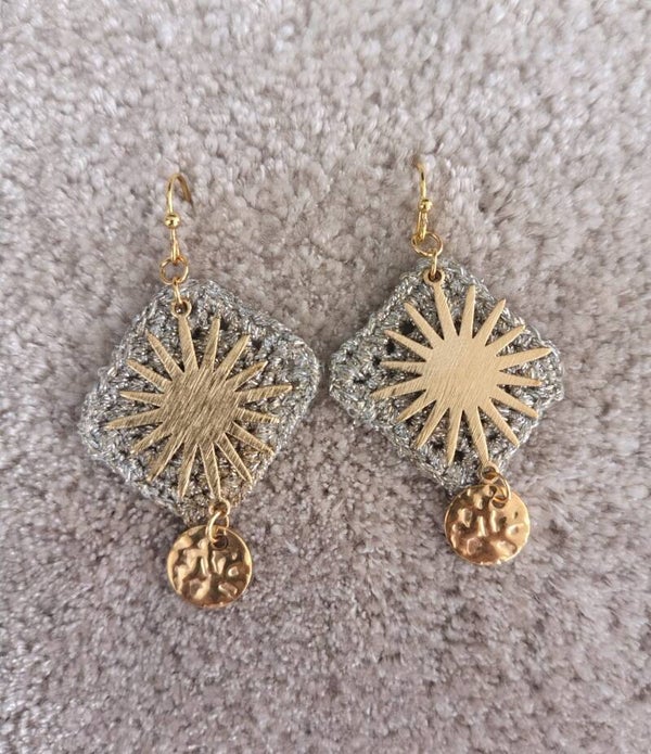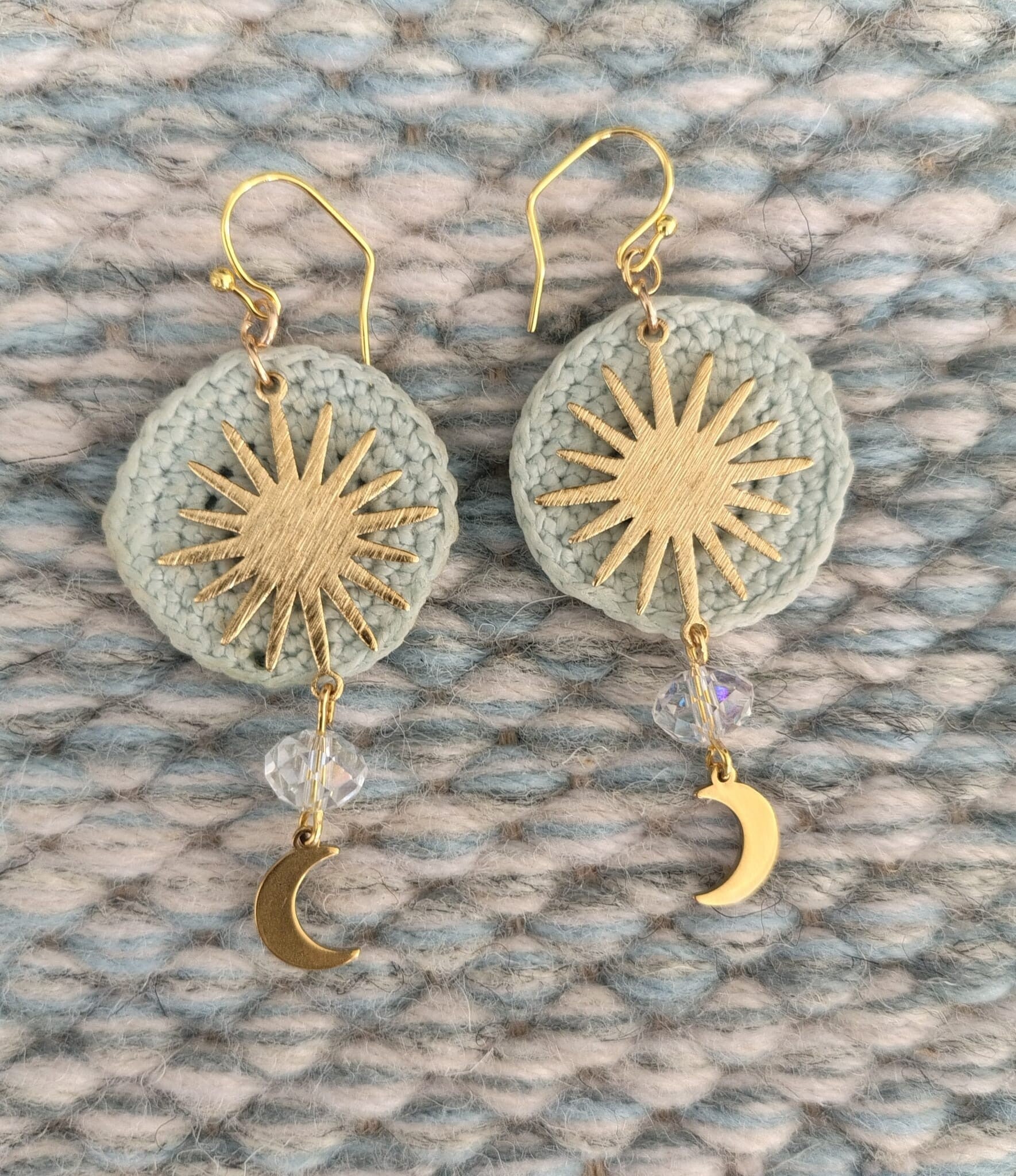 Pendientes Colección Sol y Luna azul claro , sol dorado , luna dorado y perla de cristal transparente, hechos a mano.